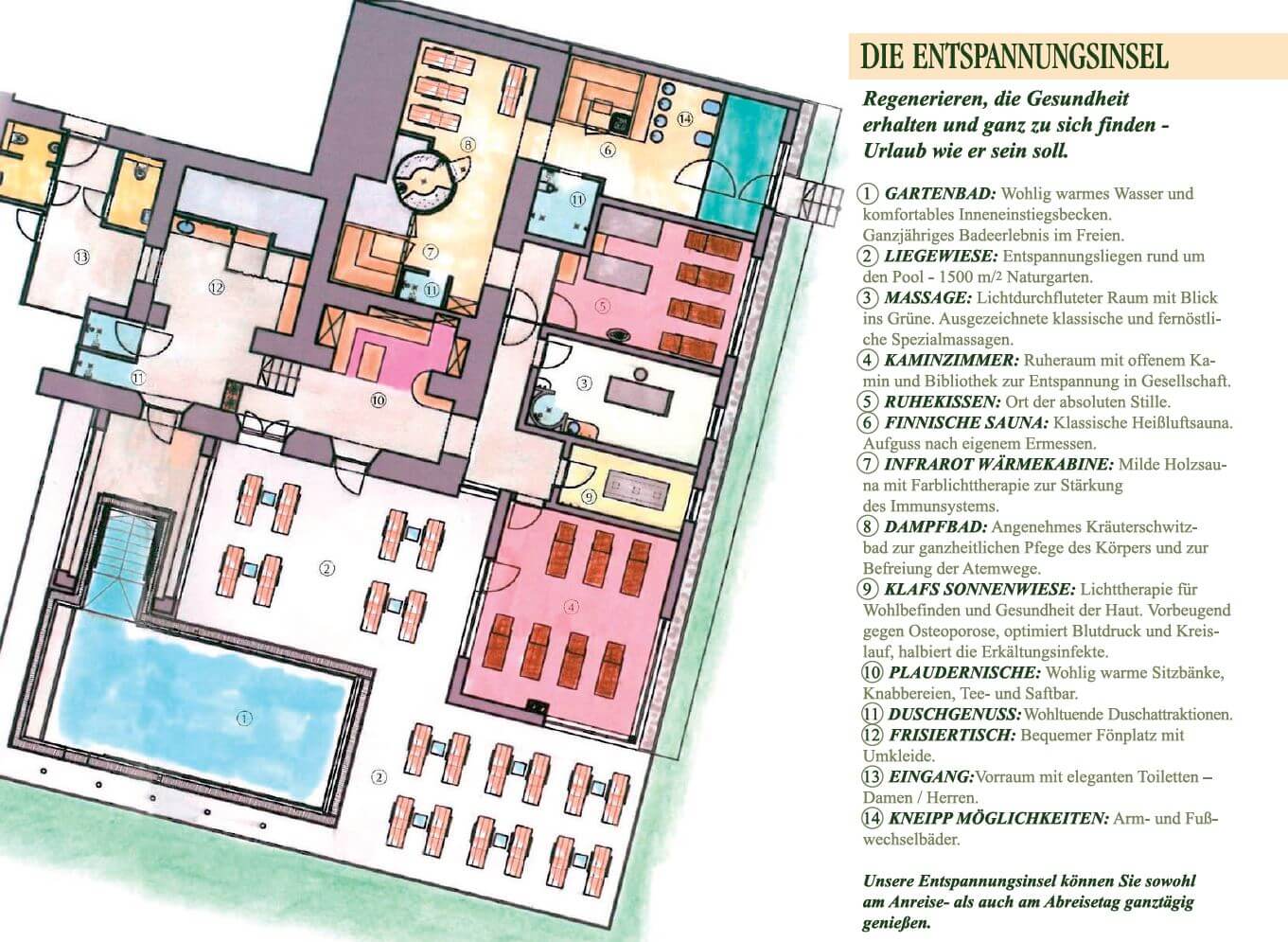 Regenerieren, die Gesundheit erhalten und ganz zu sich finden – Urlaub wie er sein soll. Das ist der Antrieb und die Idee für uns gewesen, diesen besonderen Ort in unserer Villa zu schaffen: Ein wunderbares Stück Luxus exklusiv für unsere Gäste. In der eleganten Entspannungsinsel mit Gartenbad und Inneneinstiegsbecken, Sauna, Kneipp, Massage, Klafs-Sonnenwiese und gemütlichen Ruheräumen. Duschgenuss, Plaudernische mit wohlig warmen Sitzbänken, Teebar, Mineralwasser, Knabbereien, Frisiertisch mit Föhnplatz und Umkleide.