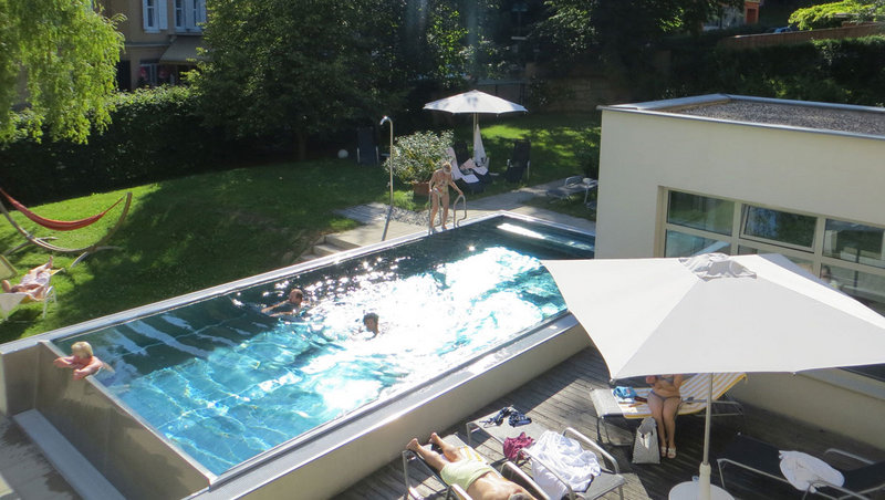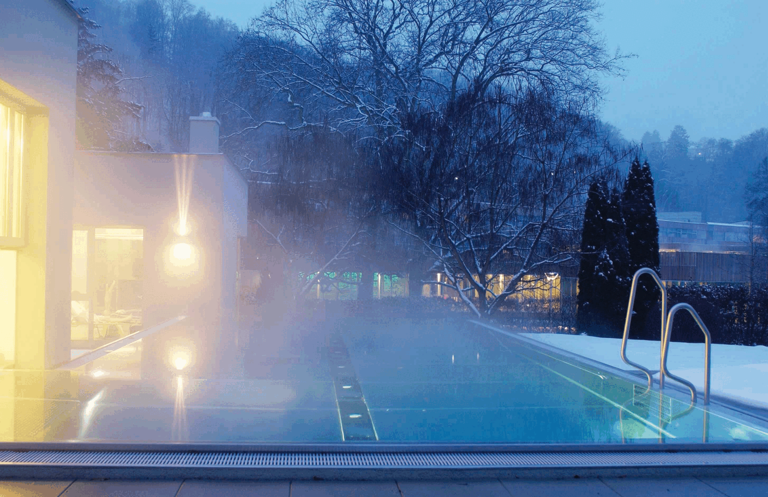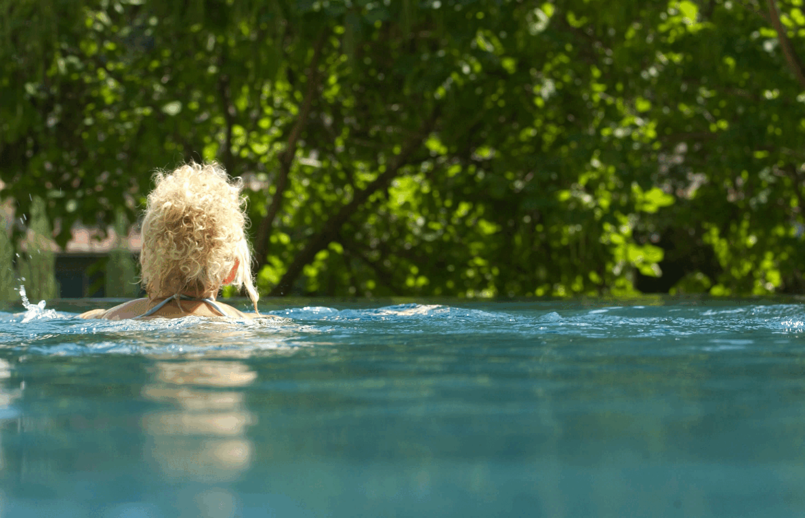 In einem ganz privaten Bad – eingebettet in den Garten der Villa Gleichenberg. Ruhe sowie Entspannung im Wasser finden und auch einmal sportlich gegen den Strom schwimmen…